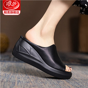 浪莎坡跟涼拖女外穿2021春新款夏天時(shí)尚高跟真皮懶人厚底魚嘴拖鞋