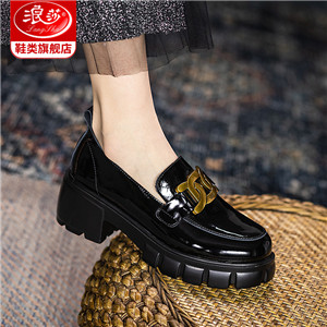 浪莎馬銜扣樂(lè)福鞋女英倫2021黑色真皮粗跟松糕一腳蹬厚底中跟單鞋